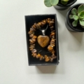 Goldens Tigers eye, small heart pendant on a wax cord chain, with a Golden Tigers eye crystal chip bracelet comes gift boxed.